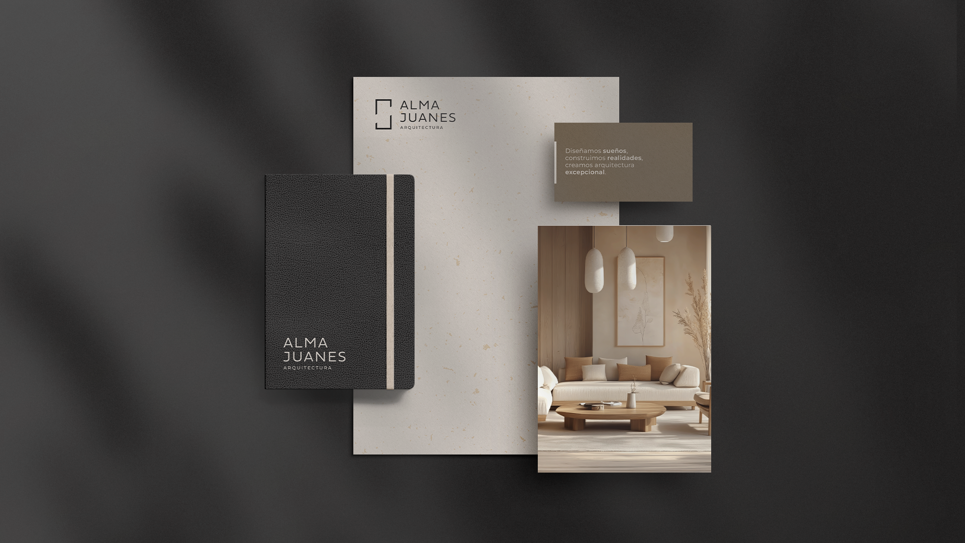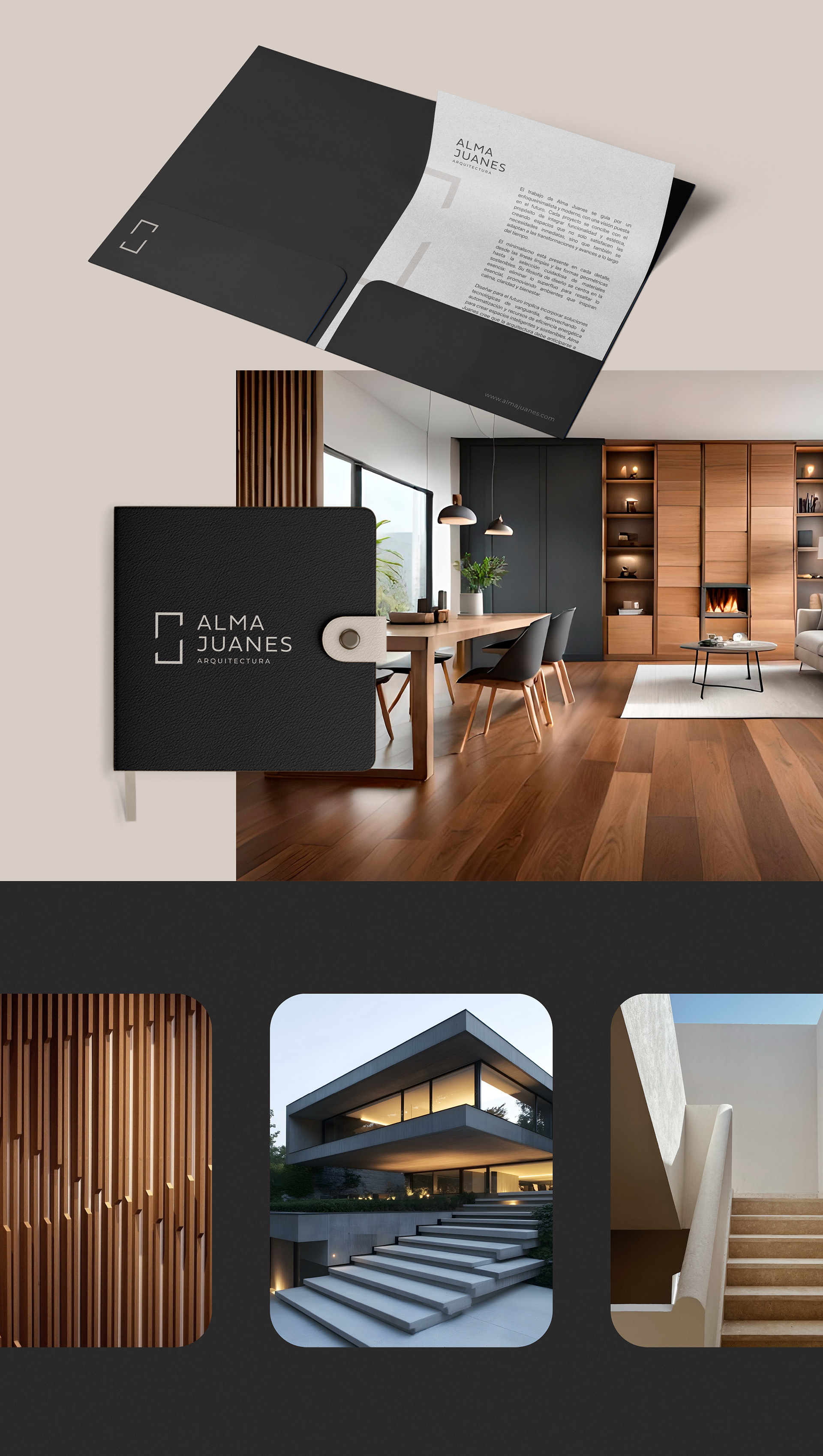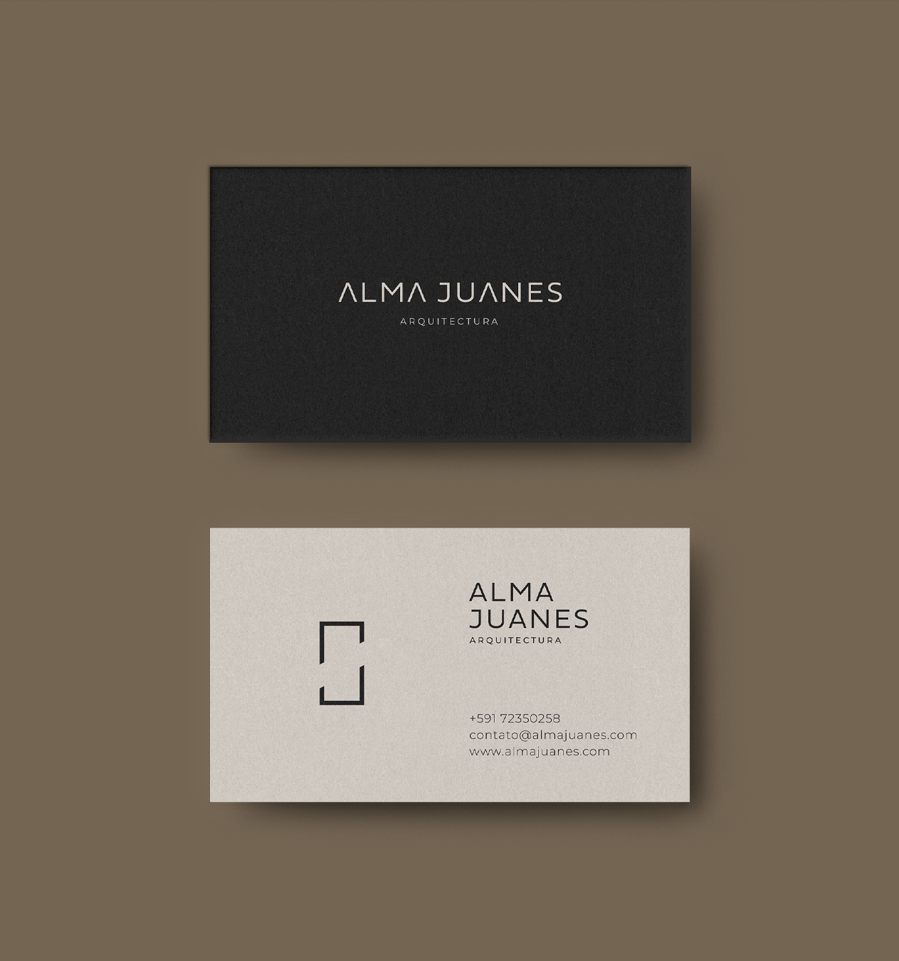 The visual identity project for Chilean architect Alma Juanes reflects her minimalist and contemporary approach, focused on timeless and sustainable architectural solutions. Each visual element has been carefully developed to capture the essence of Alma's work, which values the balance between functionality and sophisticated aesthetics.
