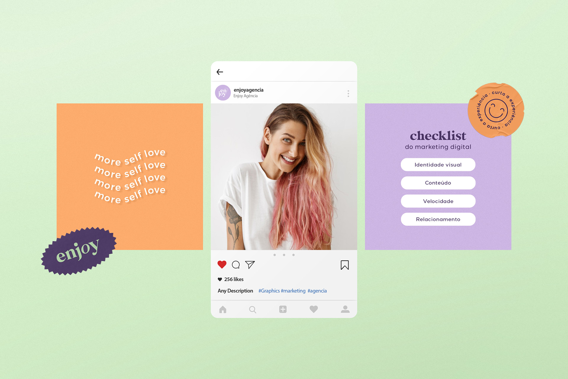 Agência de marketing digital, design gráfico e web design. Focada em trabalhar com marcas que desejam fortalecer conexões reais com seus clientes, empreendedores de espírito jovem, que curtem moda, que são divertidas, engraçadas e socialmente engajadas, que entendem a importância do design na percepção da sua marca, que se importam com a jornada do cliente e a experiência que ele vai ter. A Enjoy acredita que a diversidade é um fio condutor que conecta histórias às pessoas através do design, da arte e da moda.